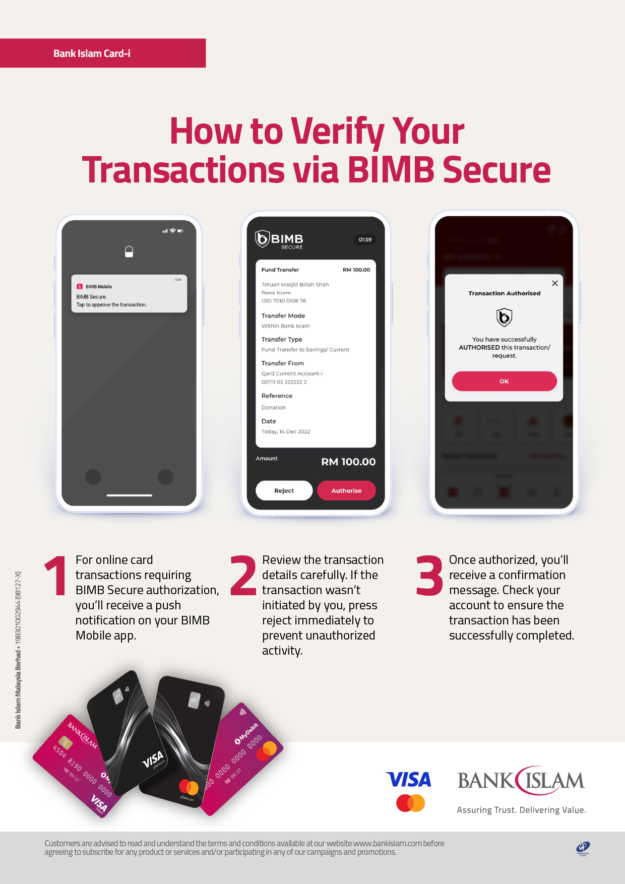 Effective 15 July 2025, SMS One-Time Password (OTP) will be replaced by BIMB Secure when authorising your Bank Islam Card-i for online transactions. The push notification is generated from your BIMB Mobile App. This enhanced security feature is to ensure your online transactions remain protected against potential fraud.