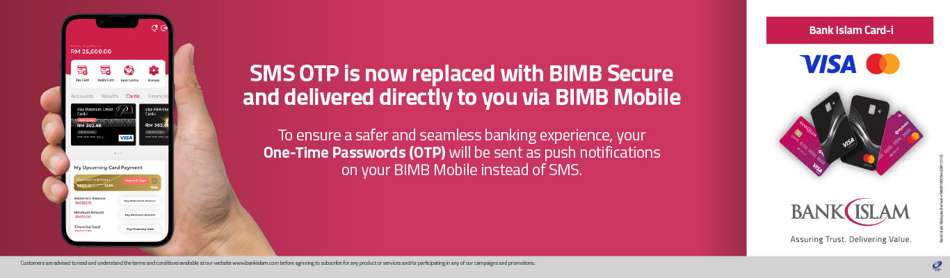 Effective 15 July 2025, SMS One-Time Password (OTP) will be replaced by BIMB Secure when authorising your Bank Islam Card-i for online transactions. The push notification is generated from your BIMB Mobile App. This enhanced security feature is to ensure your online transactions remain protected against potential fraud.