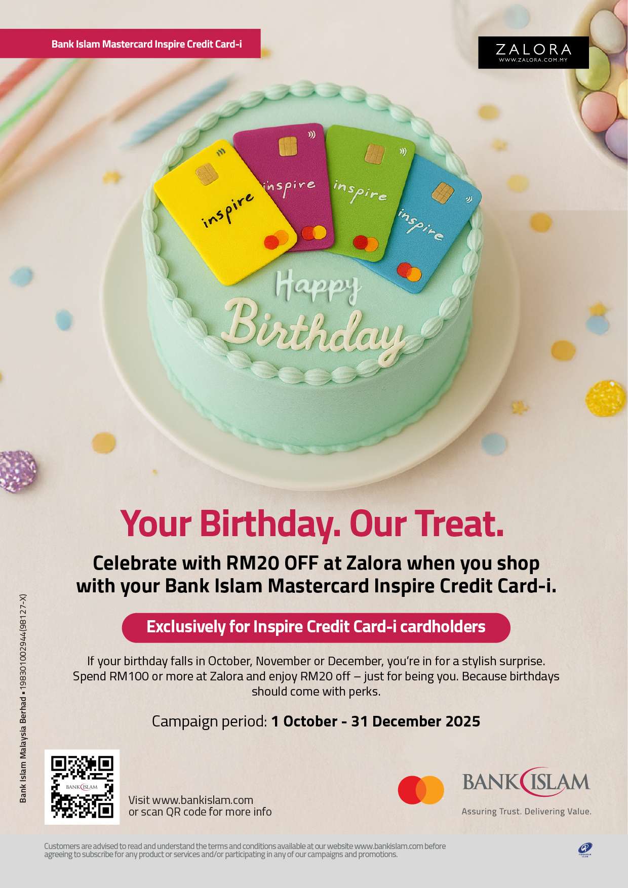 Celebrate your birthday with RM20 OFF at Zalora with Bank Islam Mastercard Inspire Credit Card-i Terms & Conditions and Disclaimer Click here to download Terms and Conditions
