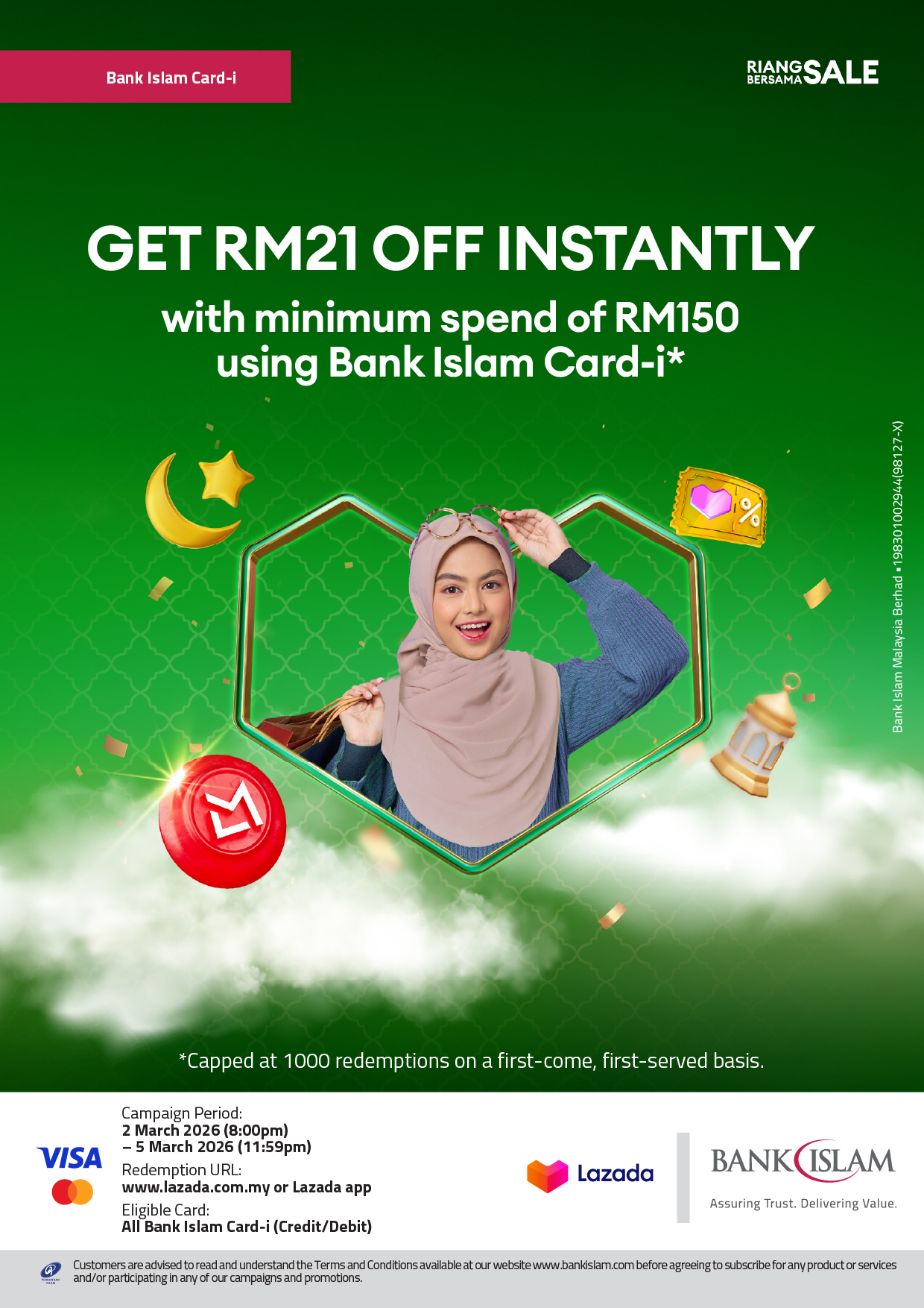 Enjoy RM21 Instant Rebate (Minimum Spend RM150) on Lazada using Bank Islam Card-i (Credit/Debit) Terms & Conditions and Disclaimer Click here to download Terms & Conditions and Disclaimer